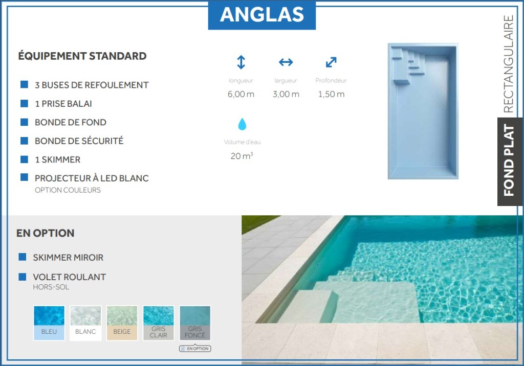 La simplicité au service de l'élégance. Le modèle Anglas offre une surface de nage maximisée avec ses lignes tendues et son design intemporel.