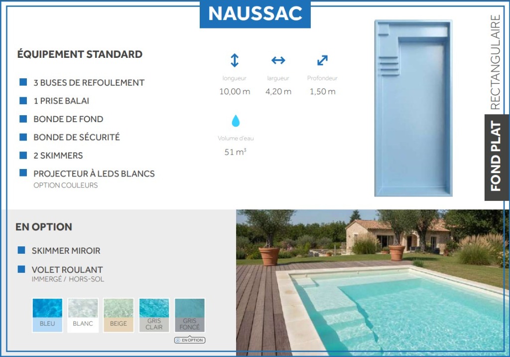 La simplicité au service de l'élégance. Le modèle Naussac offre une surface de nage maximisée avec ses lignes tendues et son design intemporel.