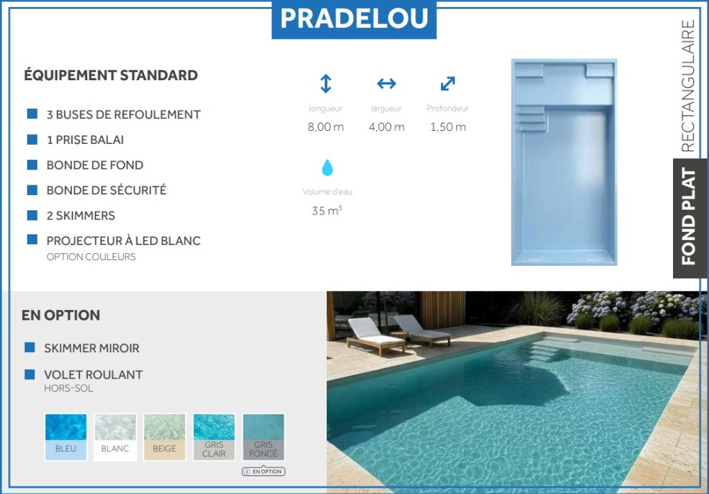 Découvrez le modèle Pradelou, une piscine aux lignes épurées et au design intemporel, conçue pour sublimer votre extérieur.