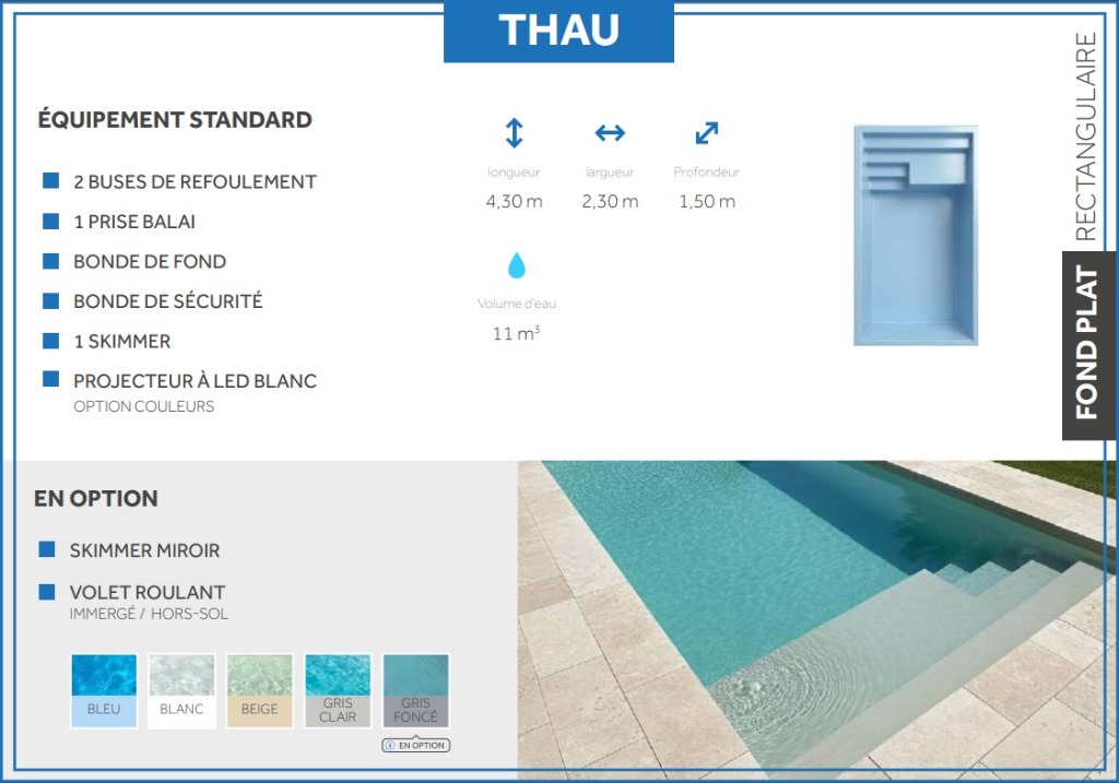 La simplicité au service de l'élégance. Le modèle Thau offre une surface de nage maximisée avec ses lignes tendues et son design intemporel.
